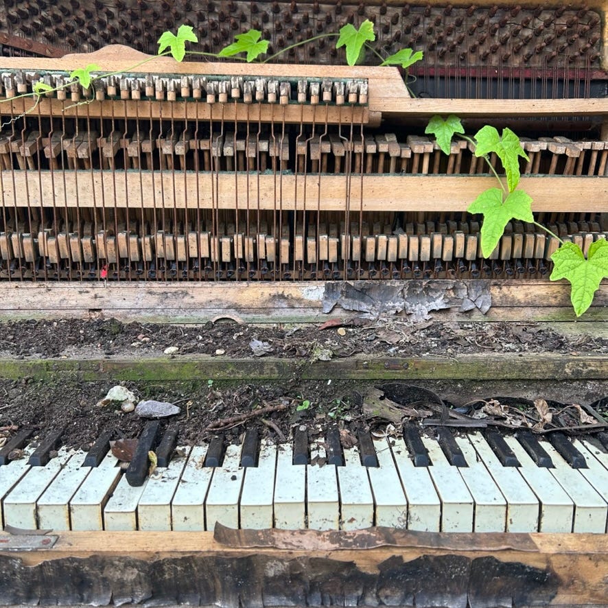 This left us wondering what to do with the old piano. It had, remember, a lot of soul. I’d spent more time communing with it over the previous couple of years than most of my friends and family. We literally live at the end of our street. There were no more families left to inherit an increasingly erratic ‘starter instrument’. But I couldn’t help thinking I owed this battered old warhorse a debt and paying someone to take it away to whatever the piano equivalent of a knacker’s yard might be felt wrong. So we moved it into the garden. One morning I quietly went out with an incense stick and thanked it and set its little piano spirit free. I committed it to the care of that same larger spirit that looks after the hamsters and cats we’ve loved and lost. And there it has stayed, in our back yard, covered in plants and pots and gradually returning to its component elements, though its bodily remains will most likely outlast our own. It was a good piano. It served hundreds of people and and this is where its story ends.